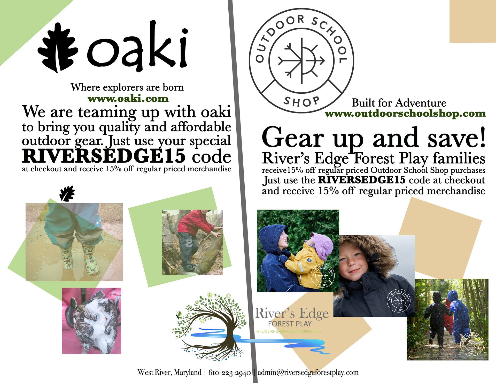 Use RIVERSEDGE15 at check out to receive 15% off regular priced merchandise at Oaki and Outdoor School Shop